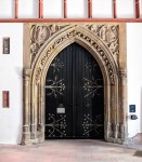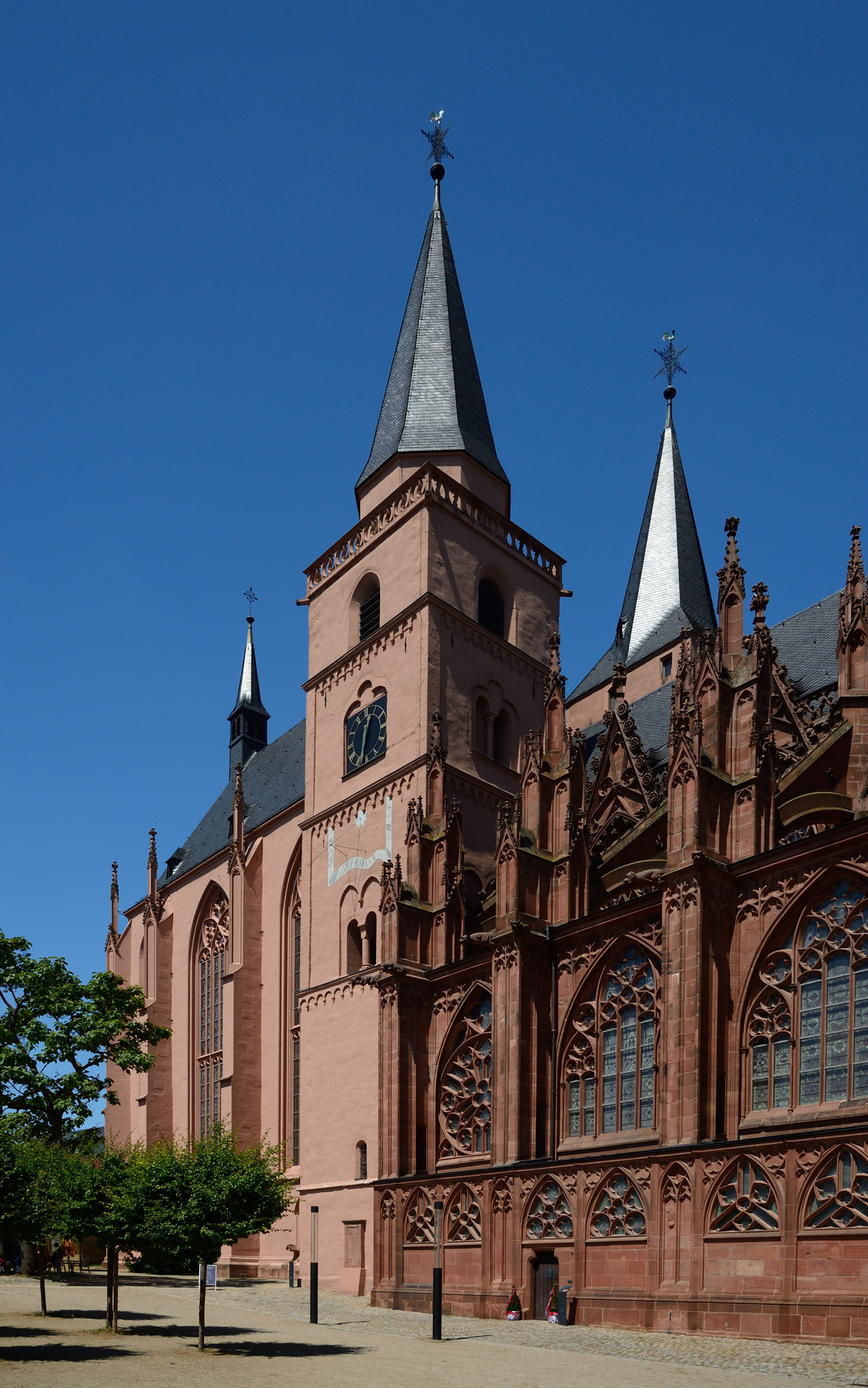 Katherinenkirche was built as a convent church and is now an evangelical (Lutheran) church. It was built in stages that can be clearly identified from the south elevation. The pink towers from the Romanesque era are the oldest visible elements. The darker, elaborate stone on the right shows the pointed arches, flying buttresses and tracery windows of the high Gothic era. The left, though plainer, is of later Gothic construction.