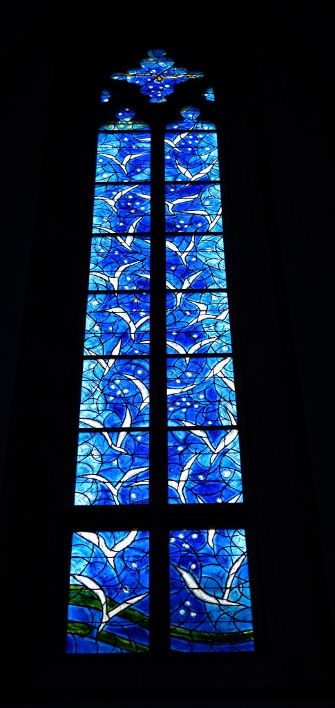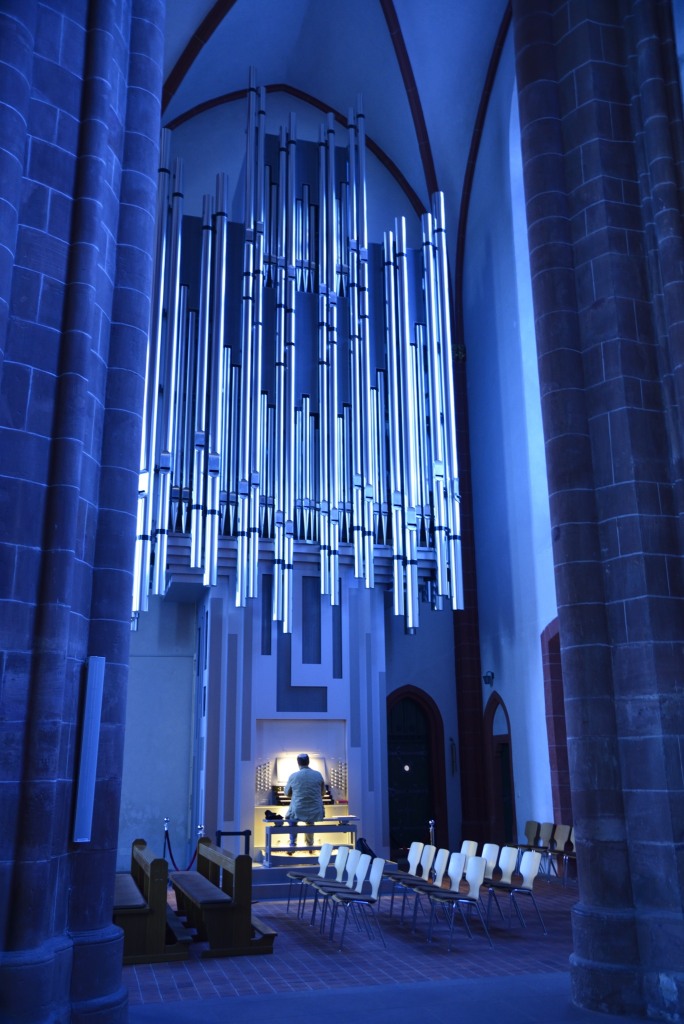 There is a large-scale rhythm created by the twelve lower level arches, triforium level paintings, clerestory and vaults. As you move around the church, into the aisles and even to the crypt, the regular division of space and round arches create a harmonious whole. In the images above, taken to the east and west respectively, one can identify the demarcation between the original work and the 18th century reconstruction. On the left, the nearest transverse arch is entirely pink stone indicating it is part of the reconstruction while the farther arches alternate yellow and pink. On the right the closest several piers are mostly yellow stone from the early building while the farther pink sections in the west are from the reconstruction. The organ was installed in 2011.
