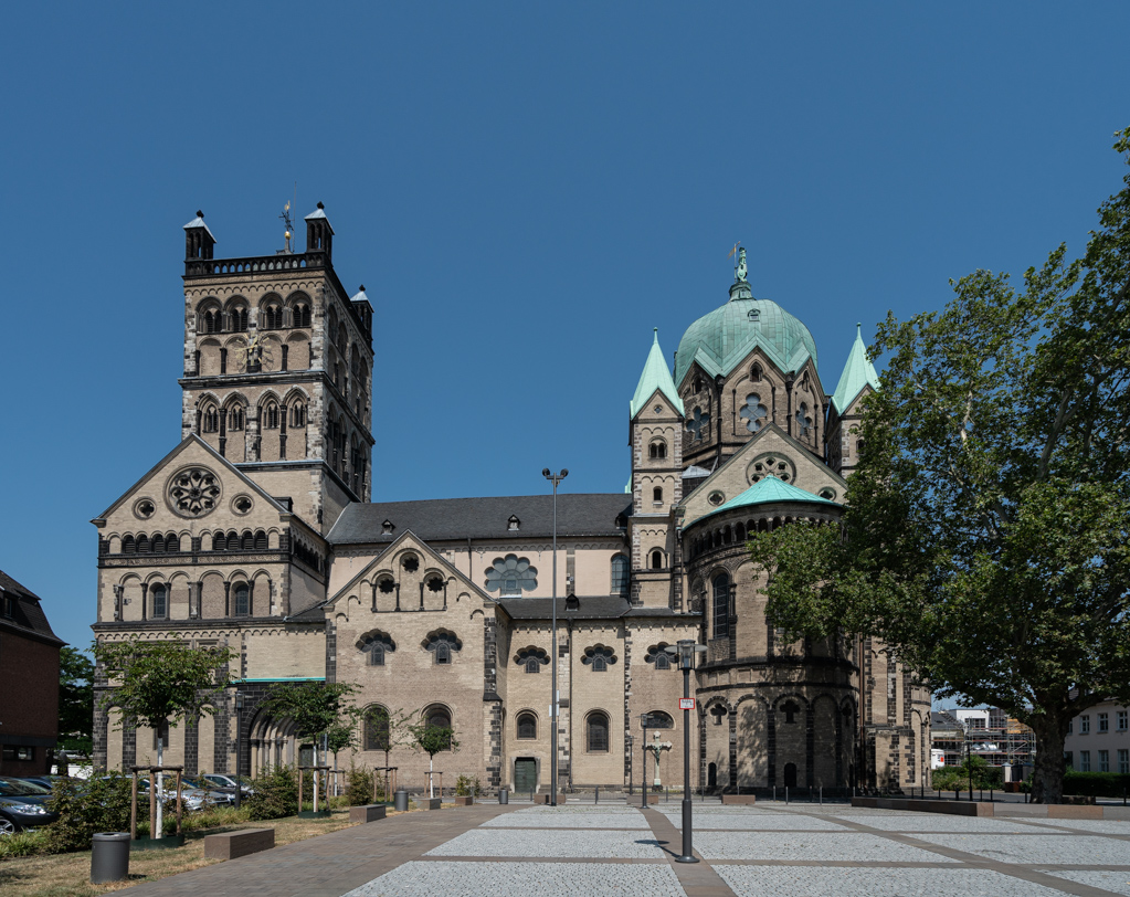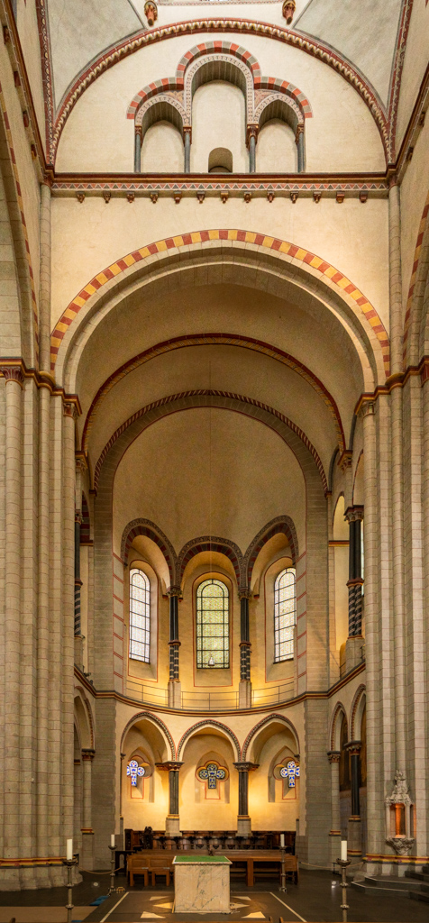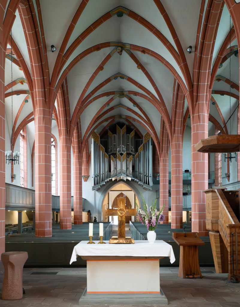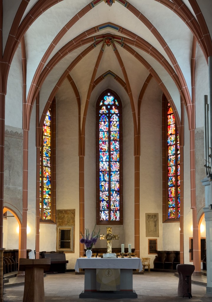Fortunately a docent was waiting near the entrance to greet us and explain what we were seeing. Allied bombing in 1944 nearly completely destroyed the historical church on this site. The church was replaced with simpler structure by 1951. A complete renovation from 2010 to 2013 resulted in the current appearance. For this summer, the pews were removed with the idea of further eliminating distractions.