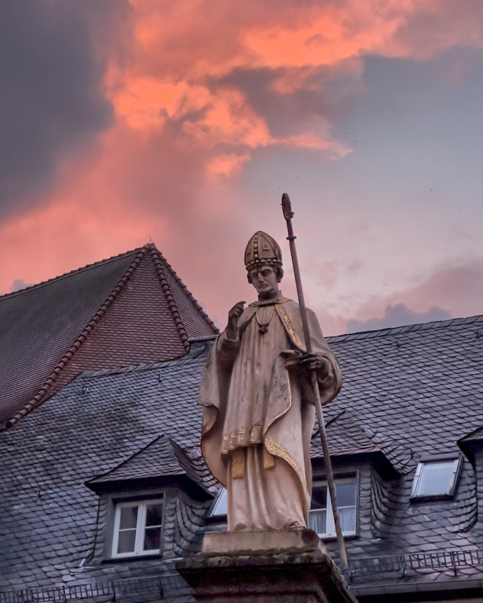 I’ve always found the dense sculptures, paintings and adornment in Baroque and Rococo churches a bit overwhelming. Perhaps it is not so for everyone. While we were there, a priest sat in a back pew, focused not on the decoration but apparently in meditation or prayer. Some people respond differently. An American walking down the center aisle loudly exclaimed to his companion, “There’s a lot of money hanging on these walls.” The priest promptly looked up and shushed him. Thankfully the man was embarrassed and apologetic.