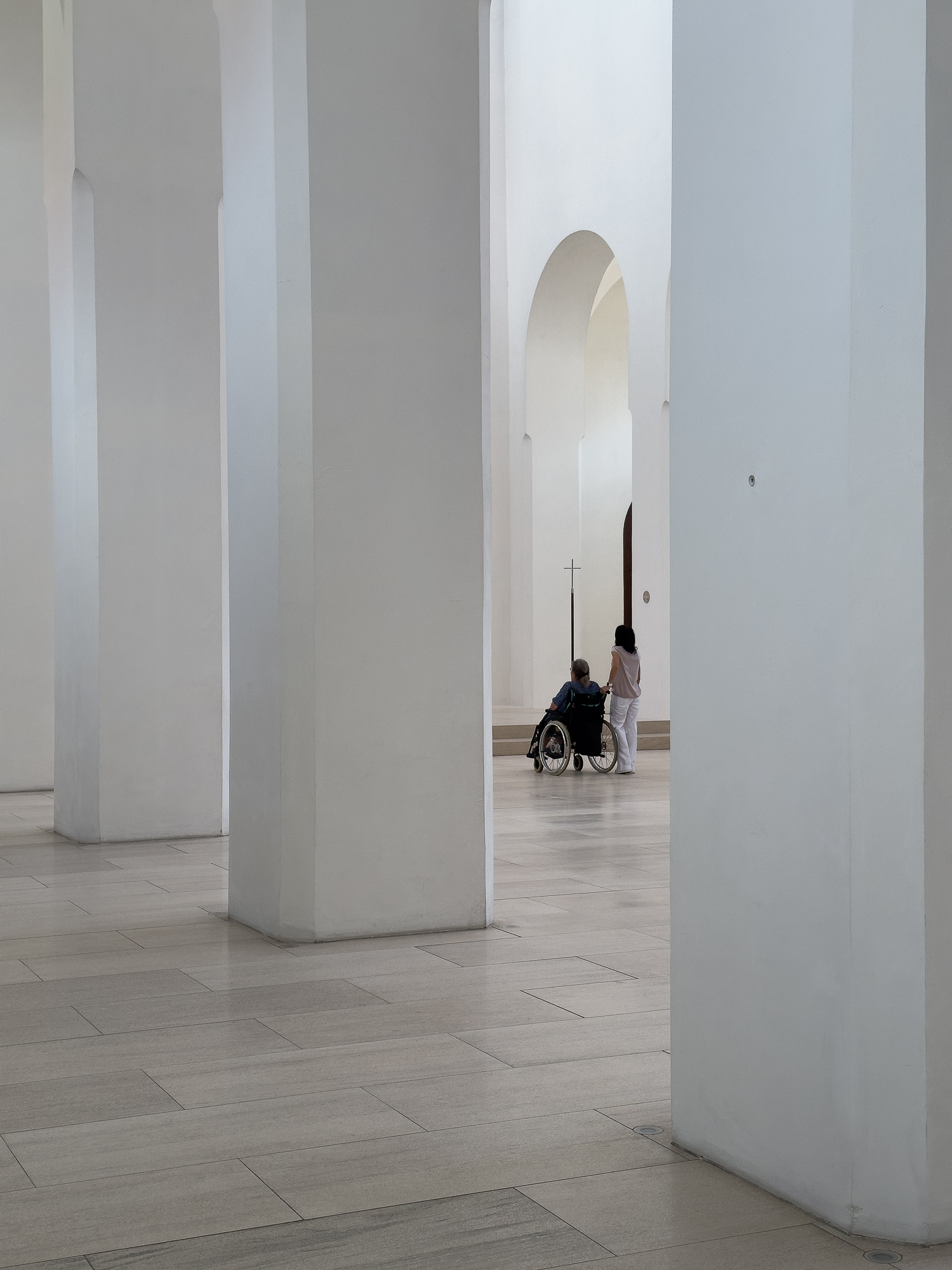 A banner in the foyer with the title “Nicht Nichts” (Not Nothing) extends an invitation to set aside the flood of sounds, words and images of the outside world and engage with the peace this empty building provides.