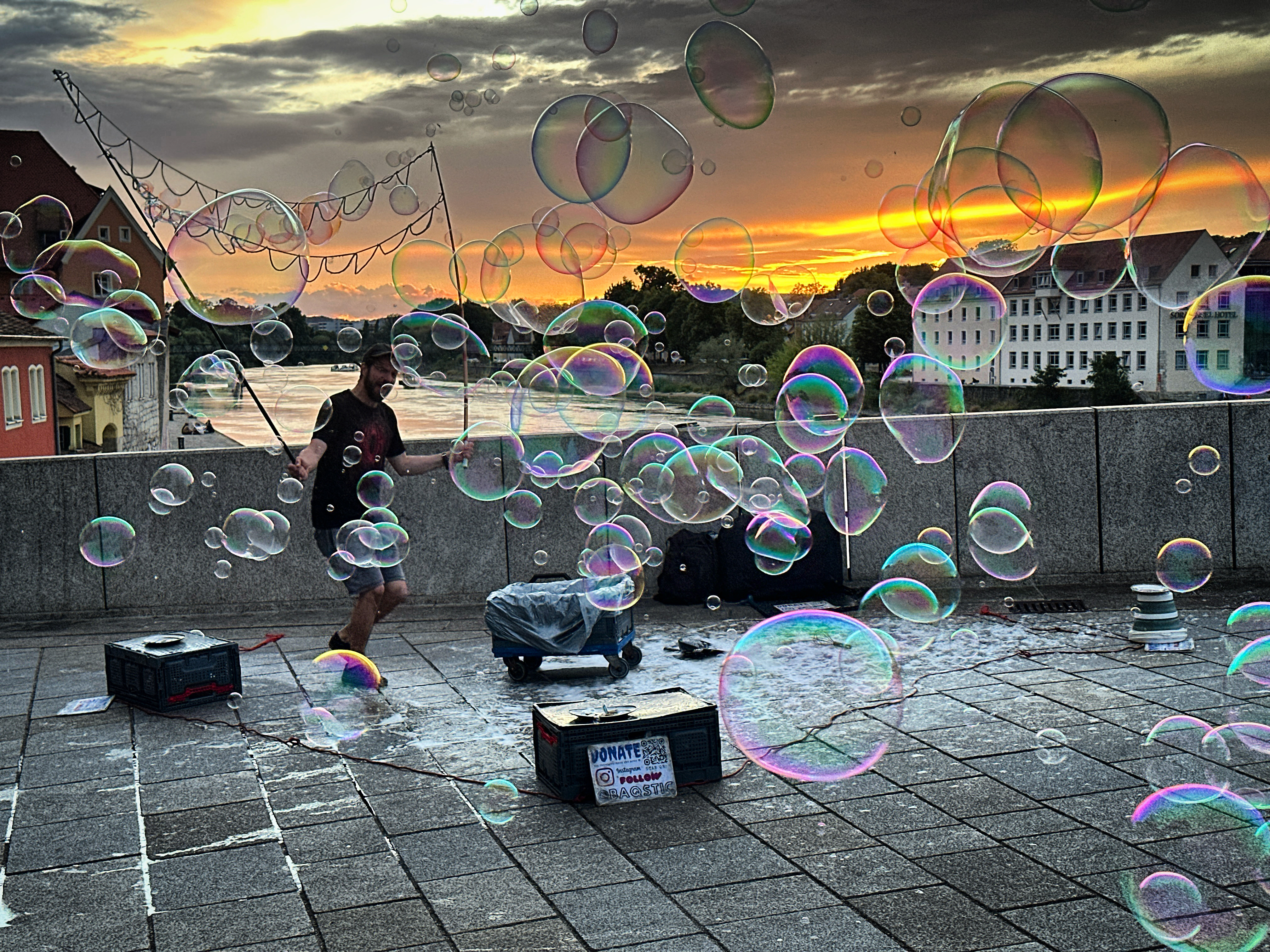 Back on the bridge, as the sun was setting, a busker entertained passersby with music and bubbles.