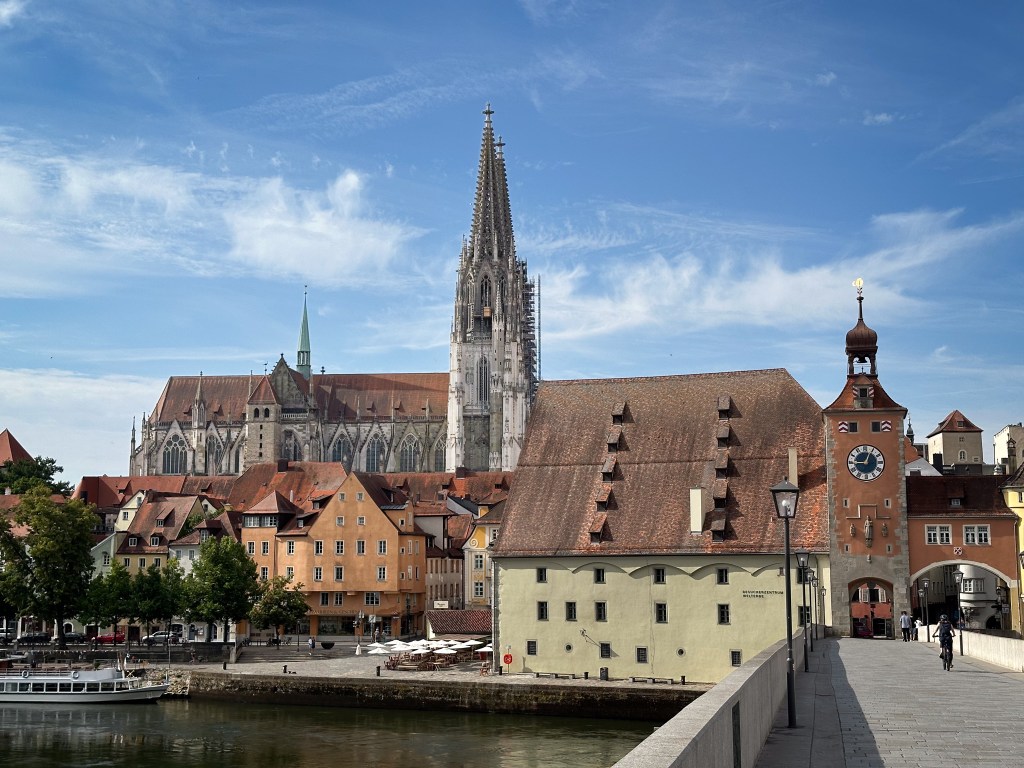 Regensburg is a lively World Heritage site on the River Danube. Viewed from the stone bridge (built ca 1135), the Cathedral of St. Peter rises above the town skyline. Below the spires, white umbrellas mark the Wurstkuchl which has been selling bratwurst for over 500 years.