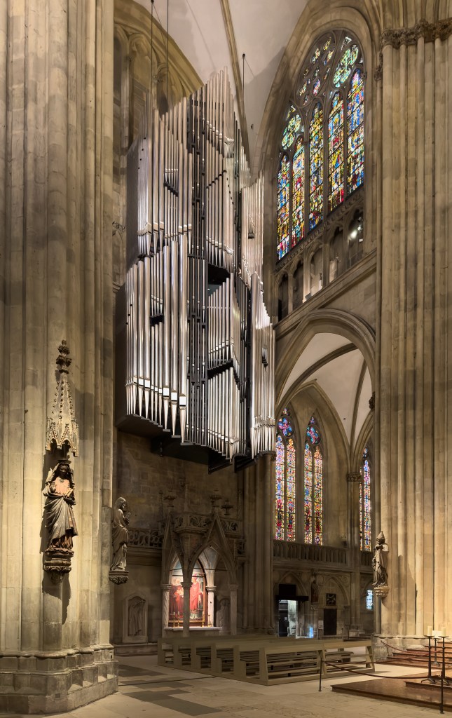 The organ in the north transept was installed in 2009. It is suspended by four cables that pass through the vault and connect to a steel structure above. The sculpture of Mary in the lower left faces the angel above the praying man in the previous image. Together they represent the annunciation and were carved about 1280/85.