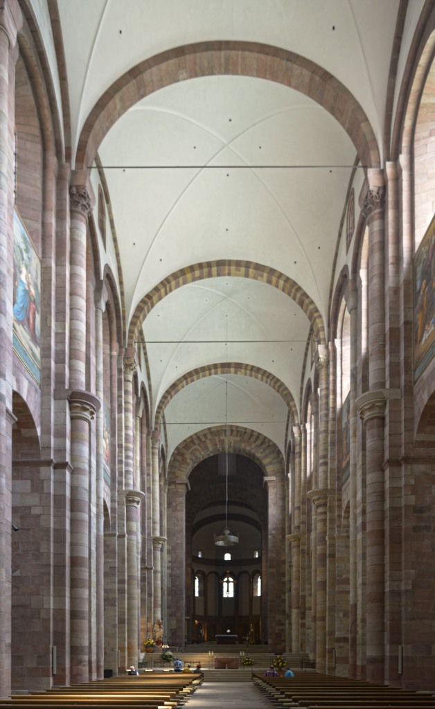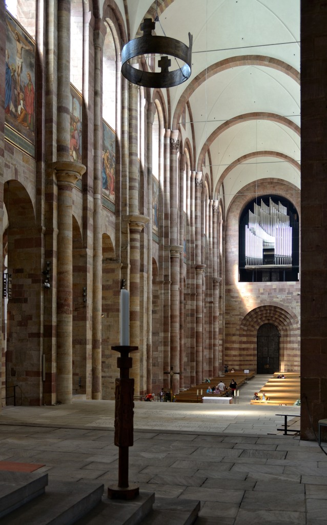 The view of the interior below shows the east choir, the oldest section of the church, and the nave. The choir is very traditional Romanesque. Along the nave, note the heavy piers and very shallow points of the arches. The ribs of the vaulted roof are among the heaviest I have seen. Perhaps these are indications that German architects, or their patrons, were only cautiously adopting the new Gothic technology. See my post about the cathedral in Magdeburg, for comparison.