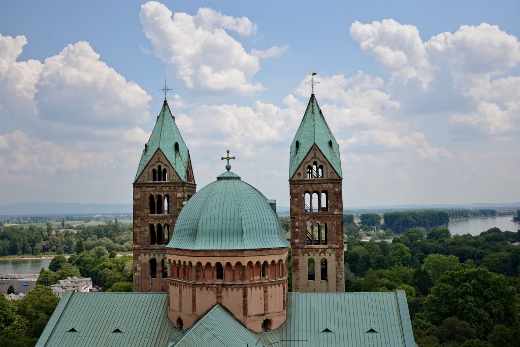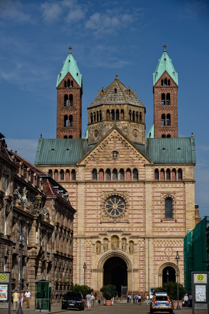Thick walls, rounded arches and relatively small windows mark the main body of the church as Romanesque. The upper stories of the four towers with their copper clad spires display the lighter structure and pointed arches of the Gothic period.