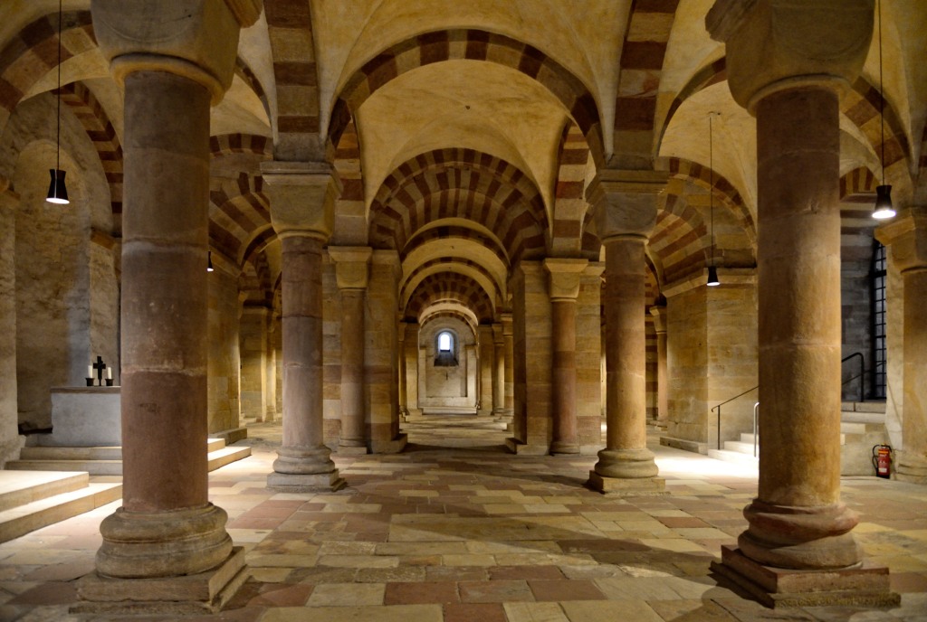 At the bottom center of the image above, between the stairs, is the tomb of the sainted, imperial couple who founded the bishopric and first cathedral. I was sure that I stood on the steps and photographed the top where their images are carved in relief, but I somehow didn’t. At the other end of the church, In the west crypt there is a shrine where their two crowned heads are displayed in a glass case on a stele.